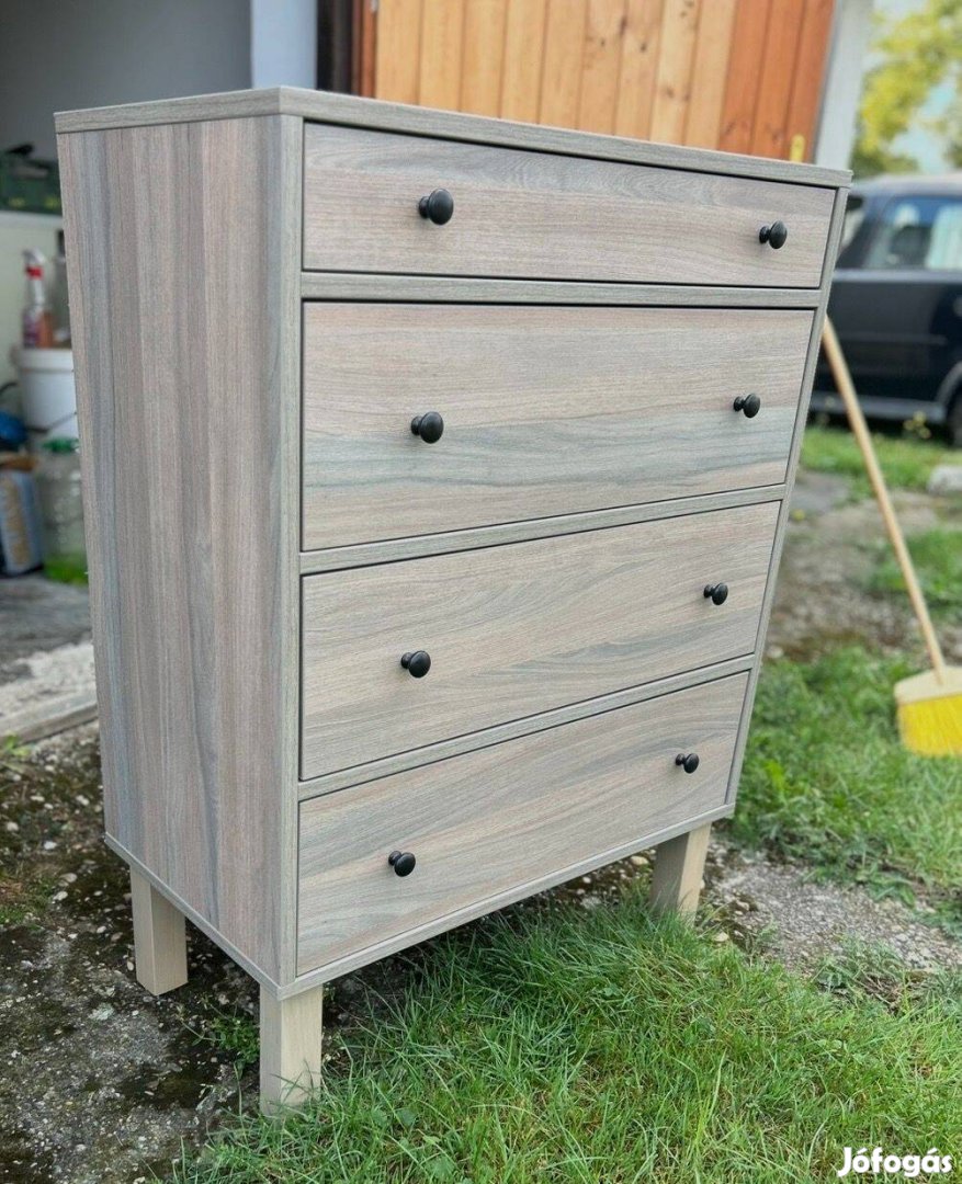Egy modern világos fa mintázatú, kis fekete gombfogantyúkkal ellátott komód került eladásra stílusváltás miatt.
