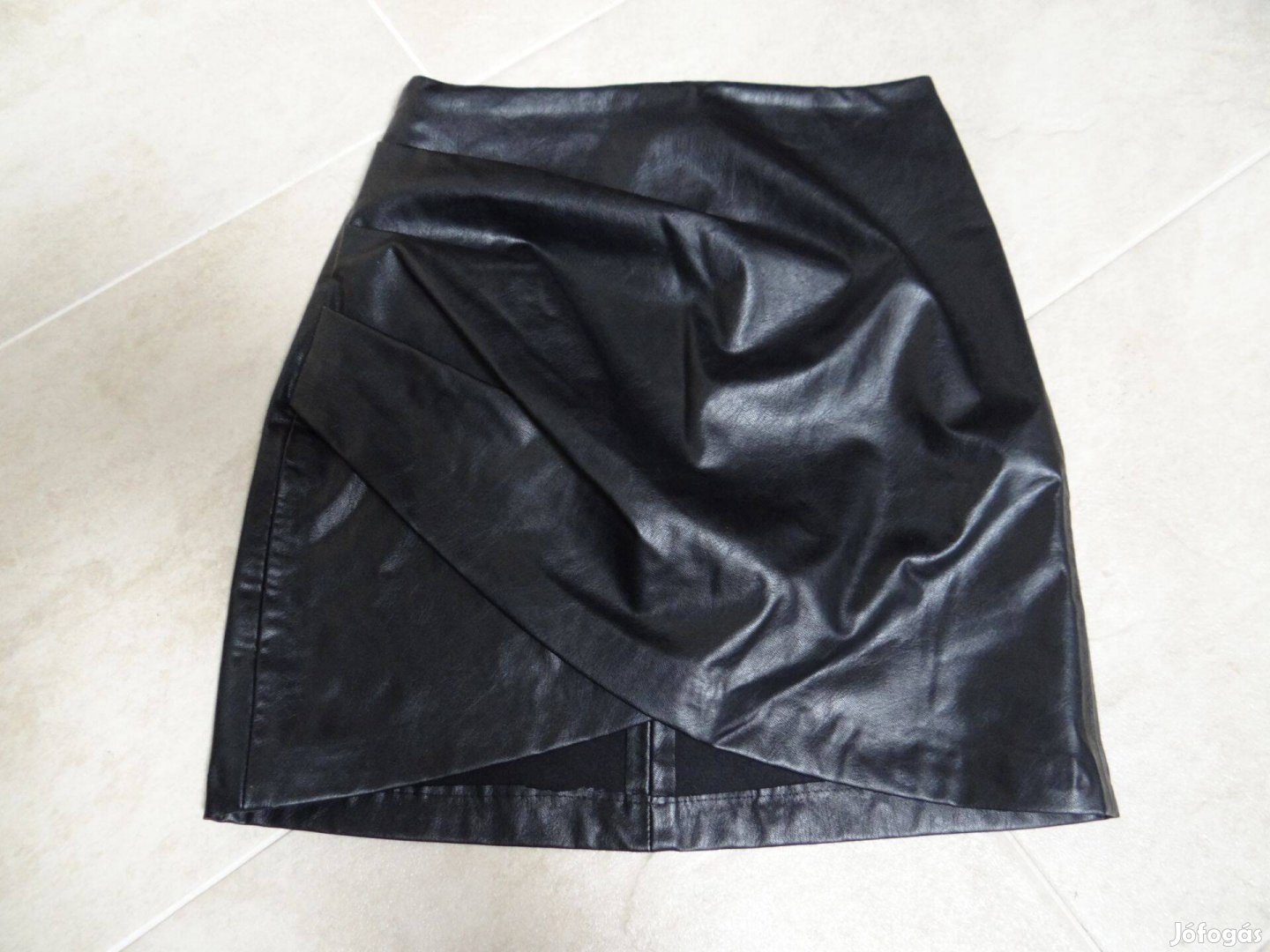 Használt, szép állapotú, hibátlan miniszoknya. Elegáns, karcsúsított fazonú, fekete színű. Bőr hatású, átlapolt, oldalán hajtásokkal díszítve. Anyaga nem rugalmas.