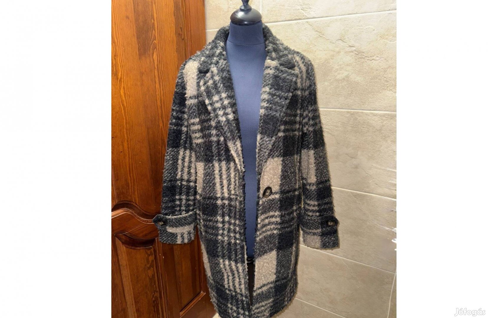 Eladó egy keveset használt, kiváló állapotban lévő, brit Tu (Sainsbury's) márkájú női átmeneti kabát. Különleges, texturált buklé anyaga és klasszikus kockás mintája miatt egyszerre modern és időtálló darab. Kifinomult drapp (bézs), világosszürke és sötétszürke kockás minta, amely szinte mindenhez passzol. Elegáns, mély kivágású galléros nyakrész, amely remekül mutat egy sállal vagy garbóval. Elöl egyetlen nagyméretű, dekoratív gombbal záródik, ami különleges megjelenést kölcsönöz neki.