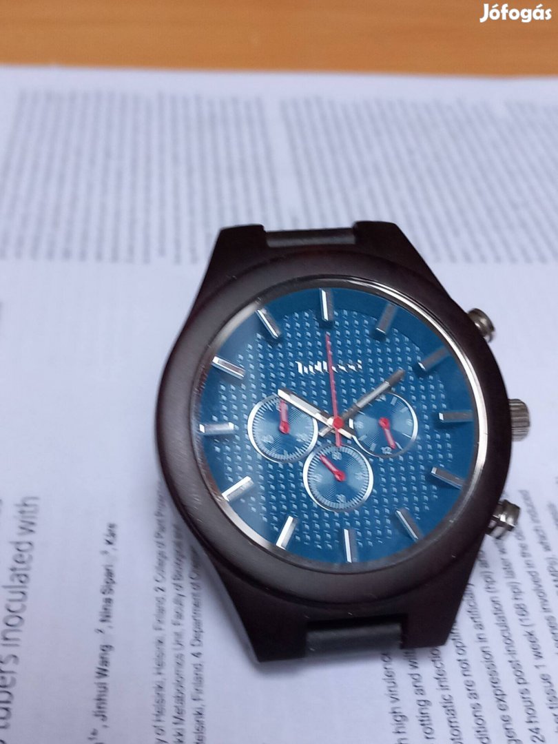 Fából készült stopperes karóra érdekes kék számlappal. Japán kvarc szerkezete új elemmel tökéletesen működik. A tok és a szíj fából készült, alig látható használati nyomokkal. A tok átmérője 43,5 mm, vastagsága 10.5 mm. Eredeti fa dobozzal.