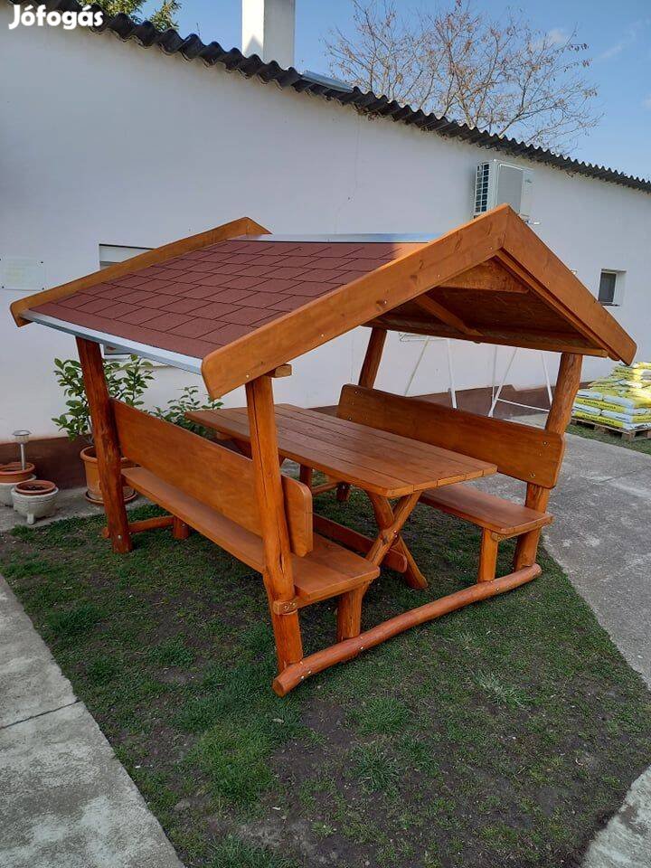 A tető és a padok egybeépítve, az asztal külön mozgatható.
