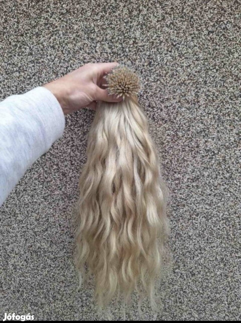 Eladó 150g, 40cm, hullámos szőke nanogyűrűs haj. Egyszer használt (3 hétig volt fent). Ár: 140.000Ft ( új ára 170.000Ft volt)